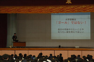 希望進路実現に向けて、志望先を知ることの大切さ、志望先と自分の学力差を知ることの大切さなどをわかりやすく説明していただきました。高校生活の半分が終了した2年生には、より一層努力しなければならないと感じることができた良い講演会でした。